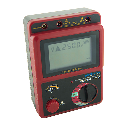 Портативный измерительный прибор Мегеон 13125 является высокоточным измерителем сопротивления изоляции, который позволяет производить измерения сопротивления, используя напряжение высокого значения (до 2500В).